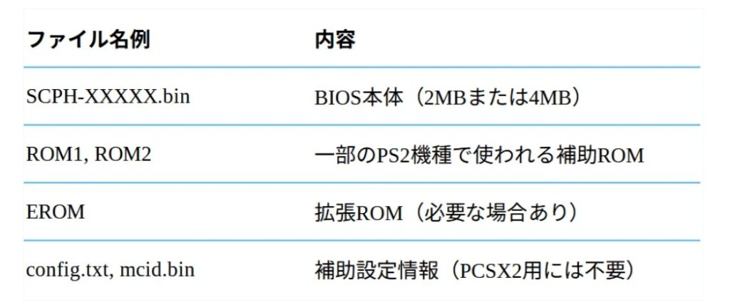PCSX2はPS2の挙動を再現するため、タイトルによってはBIOSが必要になります(※PCSX2の仕様は更新されることがあるため、最新要件は公式ドキュメントもあわせて確認してください)。