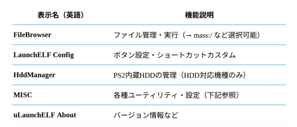 🟦 uLaunchELF 起動直後のメニュー画面(初期状態)