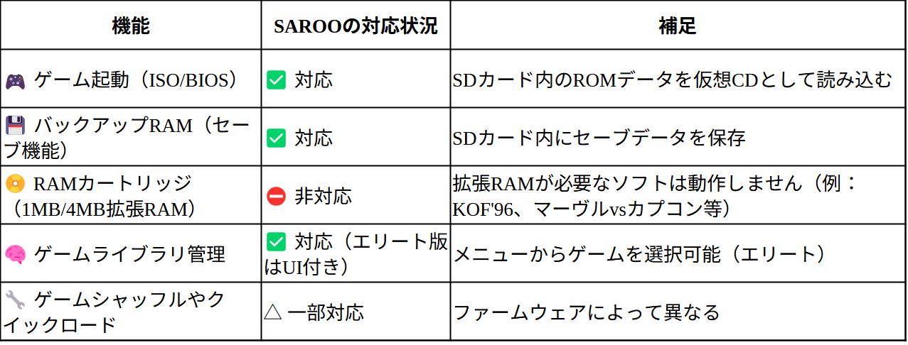 SAROO使用時に物理的な拡張RAMカートリッジ(純正または互換)を同時使用することはできません(スロットをSAROOが占有しているため)。