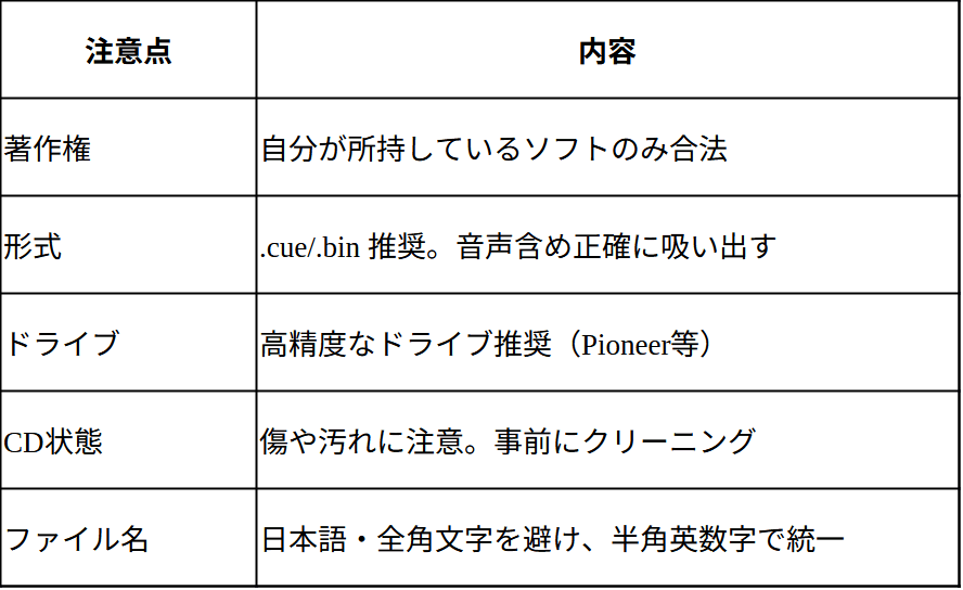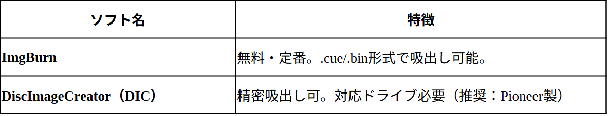 • 正確なトラック構造を吸い出したい場合は「DiscImageCreator」など高精度ツール+対応ドライブを使いましょう。